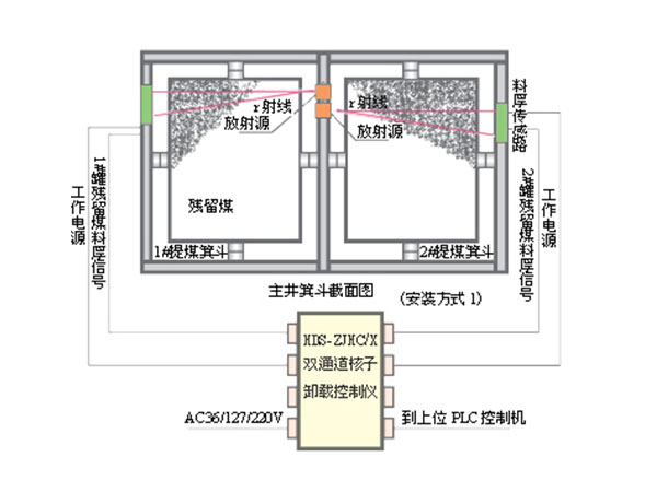 系統(tǒng)結(jié)構(gòu)示意圖 系統(tǒng)設(shè)備組成由帶輻射輸出器、屏蔽罐的放射源;射線探測(cè)器和固定支架等構(gòu)成殘留煤厚信號(hào)采集部分,由AC127V電源和本安24位單片機(jī)等構(gòu)成控制主機(jī),由本安固態(tài)繼電器版、 接線箱等構(gòu)成料后信號(hào)輸出、輸出控制部分。其中放射源經(jīng)國(guó)家環(huán)保部門檢測(cè),符《GB4792-84》安全標(biāo)準(zhǔn),不會(huì)對(duì)人體產(chǎn)生損傷,請(qǐng)用戶放心!系統(tǒng)工作原理簡(jiǎn)述放射源輸出的γ射線穿透機(jī)斗鋼板和機(jī)斗內(nèi)卸載后殘留煤,被射線探測(cè)器接收,轉(zhuǎn)換成電信號(hào)給控制主機(jī)。射線穿透鋼板和殘留煤層時(shí)要被部分吸收,被吸收的量與殘留煤層的厚度成一定的對(duì)應(yīng)關(guān)系。探測(cè)器輸出的電信號(hào)強(qiáng)度與殘留煤層的厚度具有一一對(duì)應(yīng)關(guān)系。控制儀主機(jī)通過檢測(cè)電信號(hào)的強(qiáng)度按一定的數(shù)學(xué)模型、公式,就可得出被測(cè)截面卸載殘留煤的厚度,并按設(shè)置上、下限值進(jìn)行遠(yuǎn)傳報(bào)警輸出。實(shí)用性及功能實(shí)現(xiàn)◇ 該系統(tǒng)可對(duì)主井箕斗卸載進(jìn)行有效安全控制,以免箕斗重載下放或二次裝載的事故發(fā)生?!?控制主機(jī)可檢測(cè)箕斗被測(cè)載面卸載殘留煤的厚度值,按預(yù)設(shè)的上、下限報(bào)警值進(jìn)行報(bào)警?!?給出上位主機(jī)PLC的殘留煤厚度報(bào)警值,為經(jīng)繼電器隔離的干接點(diǎn)信號(hào)(常開或常閉)。